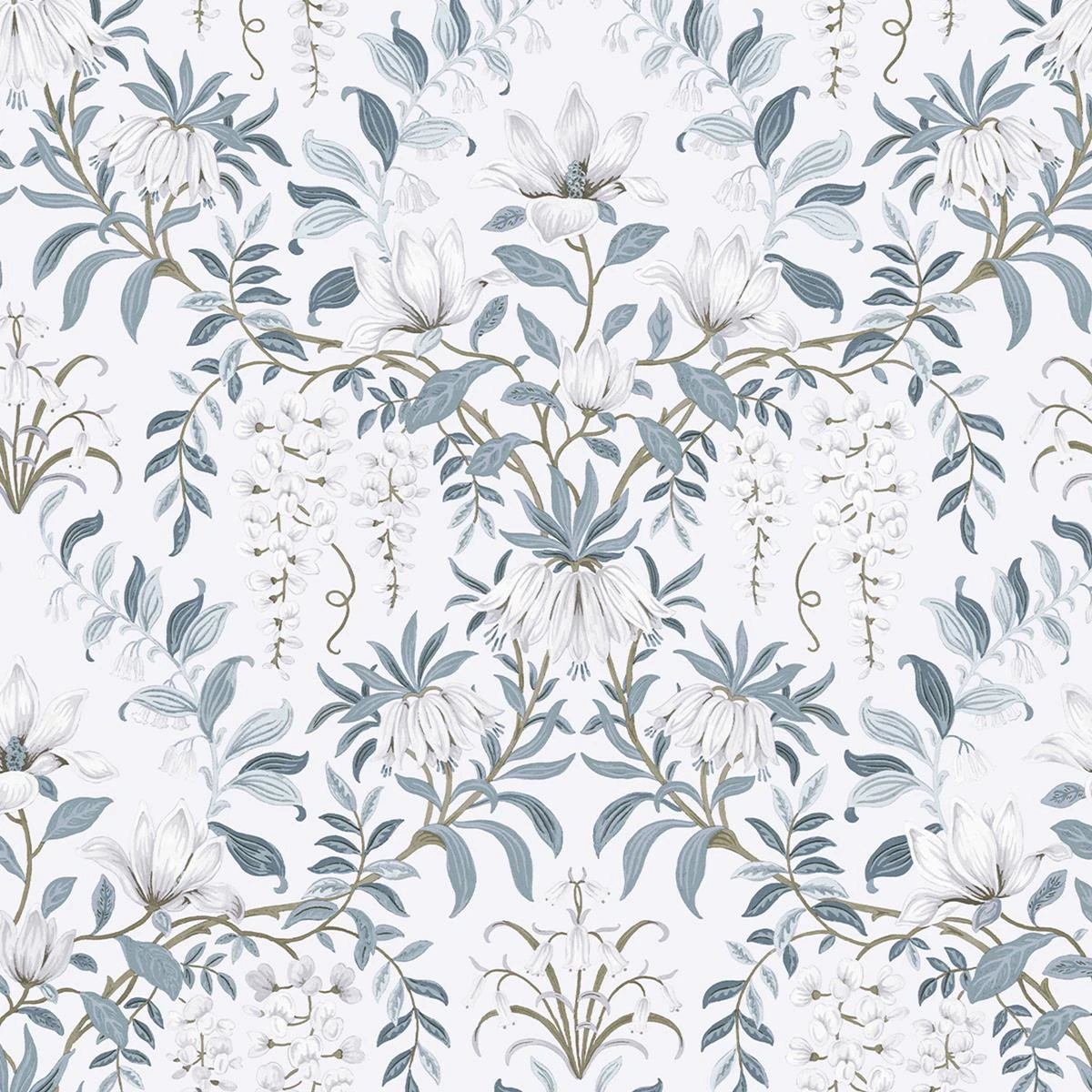 Parterre is een bloemenontwerp in vintage stijl met geschilderde witte bloemen en wervelende bladerpatronen, opgezet tegen een neutrale achtergrond voor verfijnde elegantie.